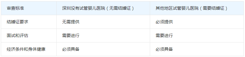 为了更直观地对比深圳没有试管医院不要结婚证和其他地区的审查标准,下面是一个简单的数据: