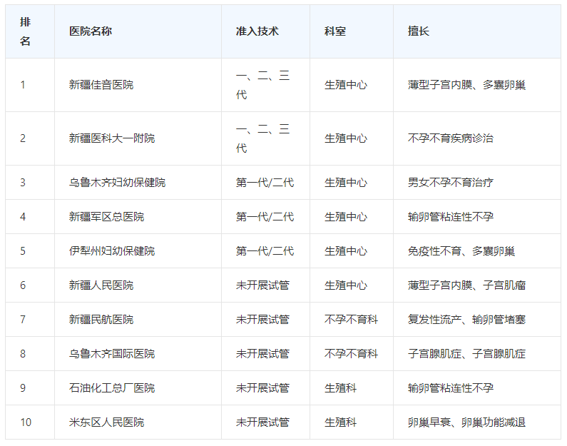 乌鲁木齐不孕不育医院排名前十的有新疆佳音医院、新疆人民医院、新疆民航医院等,这些医院都开展了治疗不孕不育疾病的科室,其中还有不少医院支持做试管,例如新疆佳音医院、新疆医科大一附院就可以做一代、二代、三代试管,成功率甚至可以达到55%以上,是当地非常热门的生殖医院。