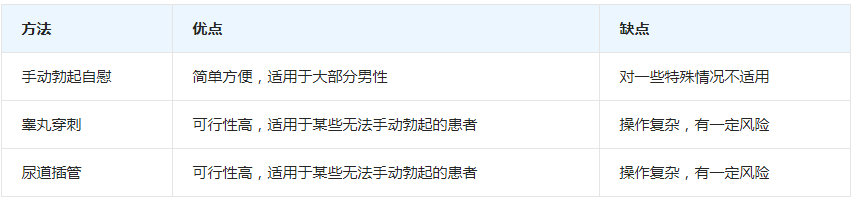 下面是手动勃起自慰、睾丸穿刺和尿道插管三种取精方法的比较:
